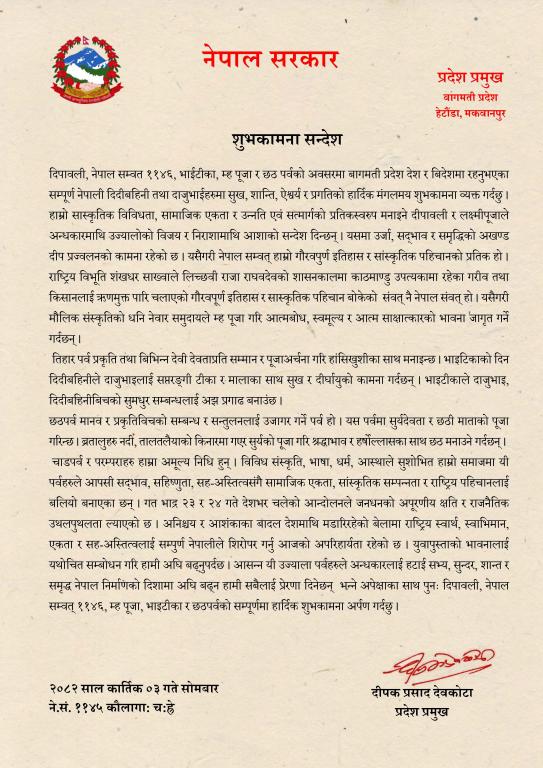 माननीय प्रदेश प्रमुख श्री दीपक प्रसाद देवकोटाज्यूले दिपावली, म्ह पूजा र छठ पर्वको अवसरमा दिनुभएको शुभकामना सन्देश ।
