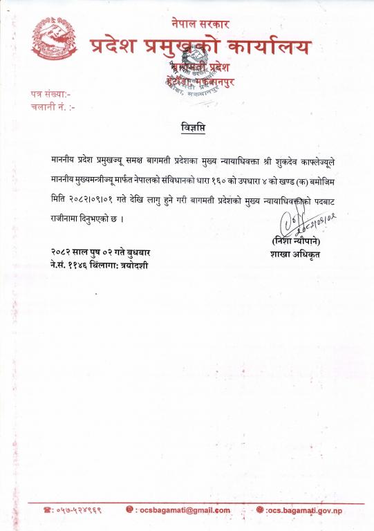 ०८२/०८३ दस्तावेज २०८२।०९।०२ मुख्यन्यायाधिवक्ता श्री शुकदेव काफ्लेज्यूको राजिनामा.pdf मिति २०८२-०९-०२ set to popup