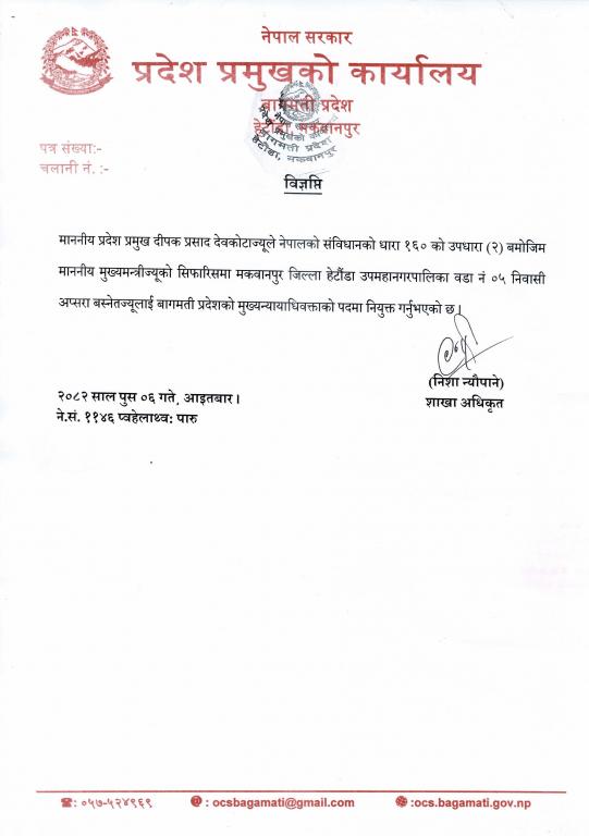 बागमती प्रदेशका मुख्य न्यायाधिवक्ताको पदमा नियुक्ती ।