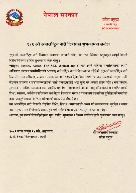माननीय प्रदेश प्रमुख दीपक प्रसाद देवकोटाज्यूले ११६ औं अन्तर्राष्ट्रिय नारी दिवसको अवसरमा दिनुभएको शुभकामना सन्देश ।