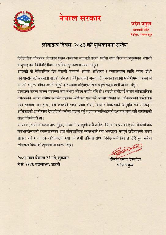 माननीय प्रदेश प्रमुख श्री दीपक प्रसाद देवकोटाज्यूले लोकतन्त्र दिवस, २०८३ को अवसरमा दिनुभएको शुभकामना सन्देश ।